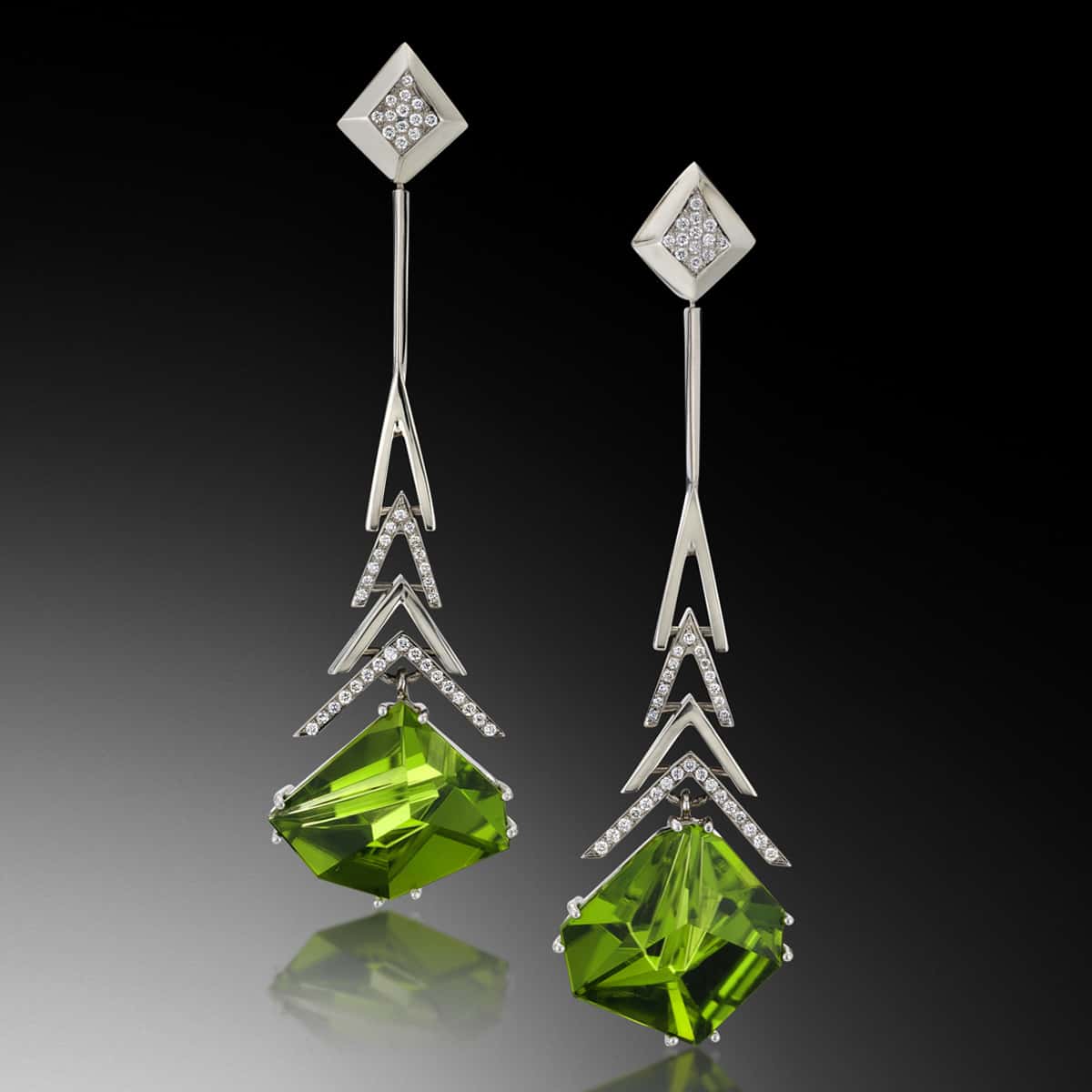 Crescendo peridot earrings are dramatic and dynamic. This enchanting design features two stunning peridot, cut by lapidary Tom Munsteiner, suspended delicately below angular forms of white gold, accented with diamond pavé.
